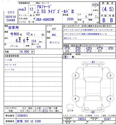 | Chassis No. | 3BA-AGH30W-0390451 | Model Code | S type Gold 2 |